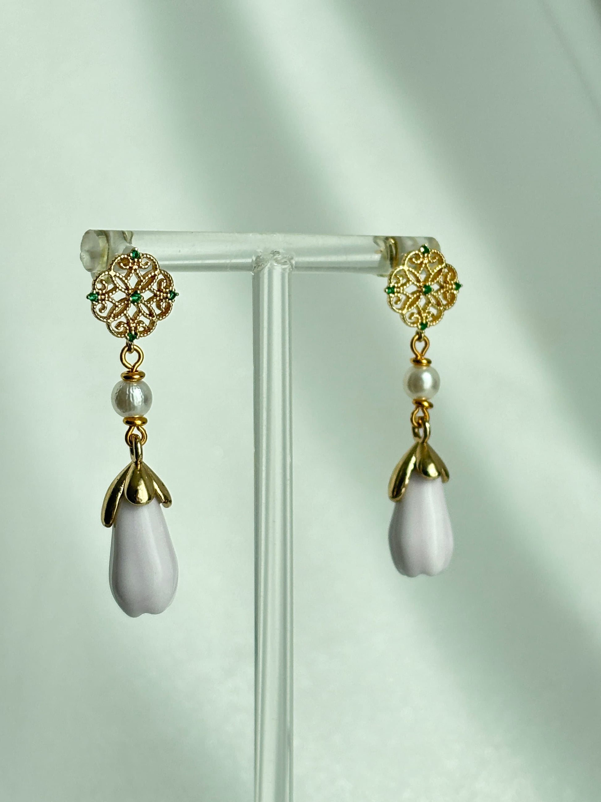 Paired with lustrous round and teardrop ceramic droplet, these earrings evoke the image of fresh dewdrops glistening on a flower at dawn. The combination of the soft glow of the ceramic and the intricate gold filigree creates a stunning display of elegance and sophistication.
