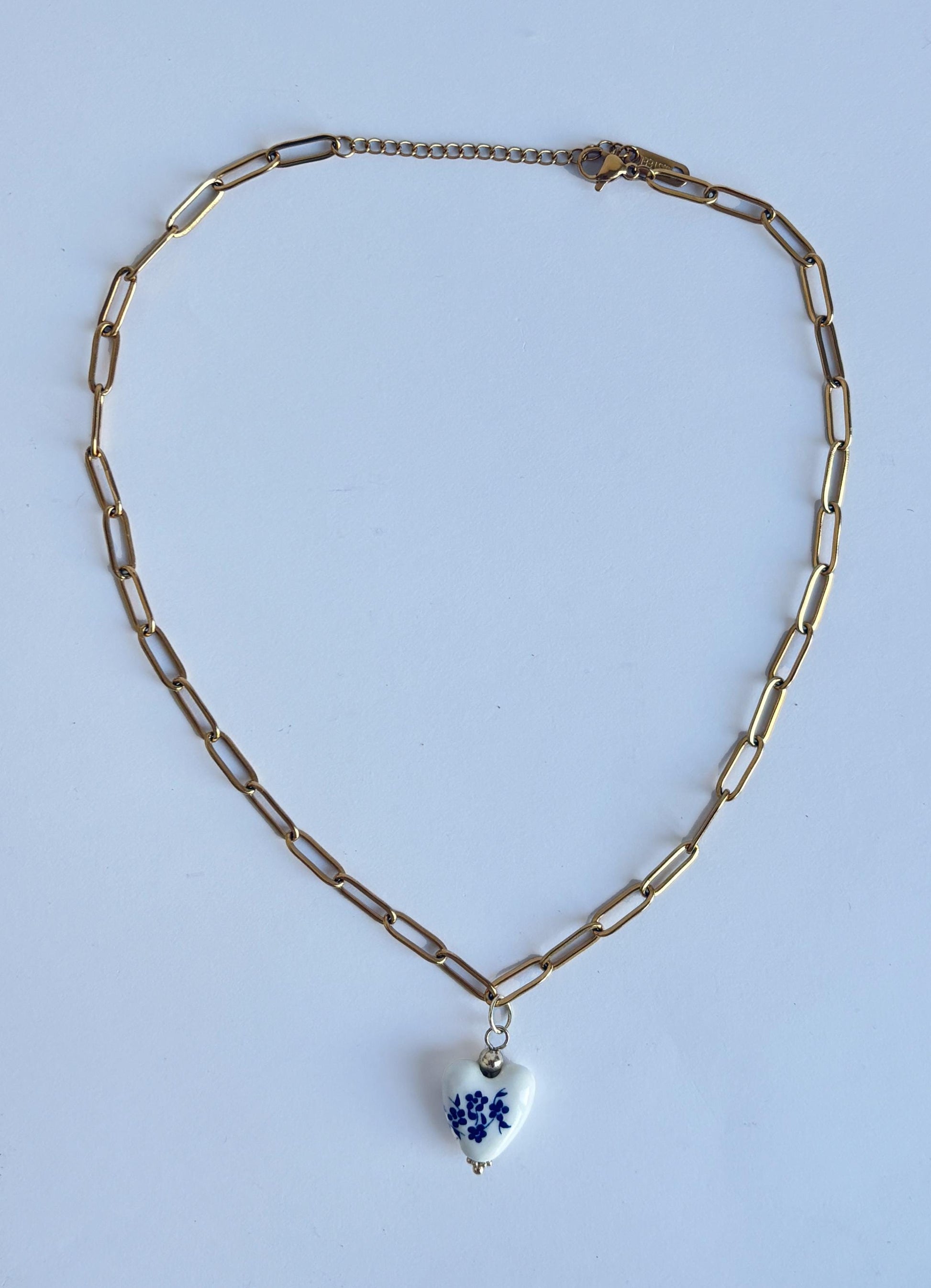 This handmade necklace features a delicate heart-shaped porcelain pendant, hand-painted in the timeless blue-and-white floral style of traditional Chinese ceramics. The heart, a symbol of romance and eternal love, is adorned with tiny blossoms that represent resilience, growth, and beauty.