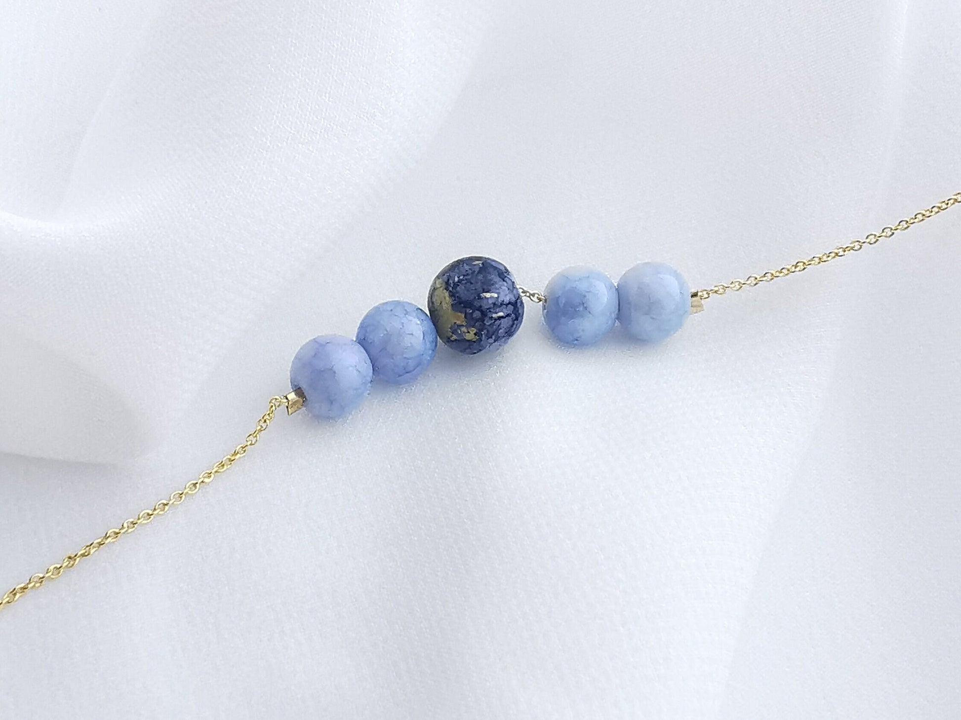Our ink-imagination product combines modern craftsmanship with traditional Chinese ink painting. The bracelet features five layers of different shades of blue beads strung together on an 18k gold chain plated string, resembling blue ink spreading across three-dimensional beads, creating a beautiful yet dignified look.