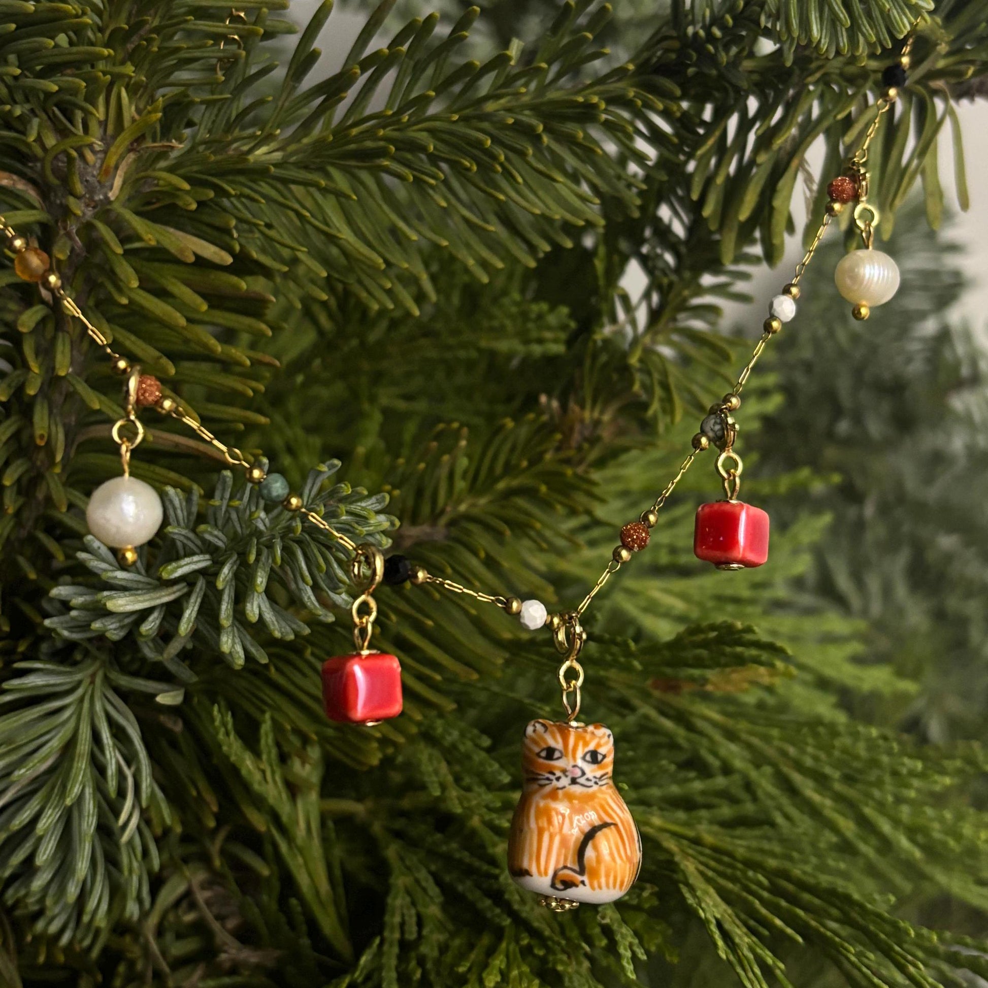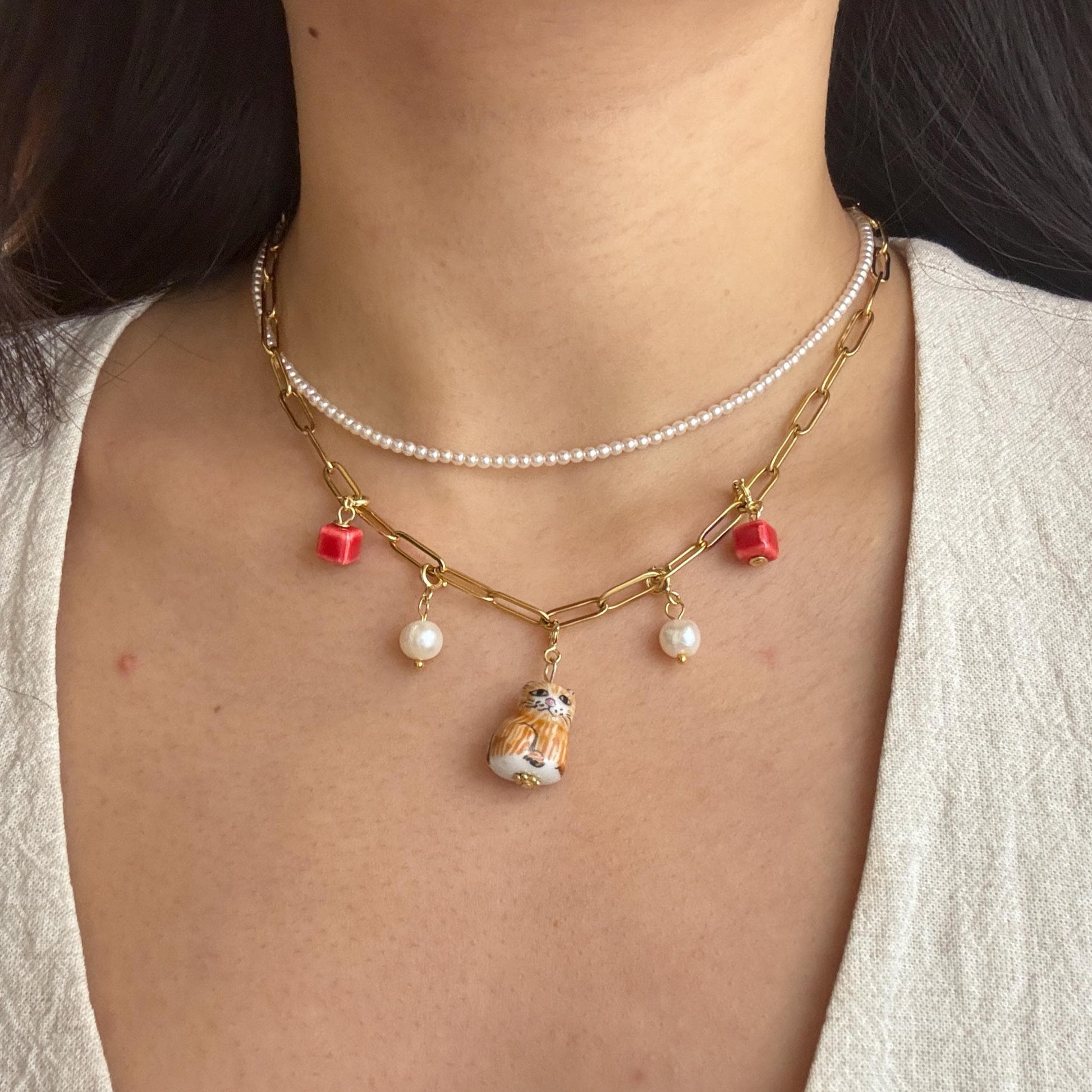 The main piece of this necklace is a porcelain kitty, attached to a gold-plated necklace with 4 other beads, 2 on each side, select from the 4th photo, make sure to include your selection in a message to us for the combination you would like to make :)