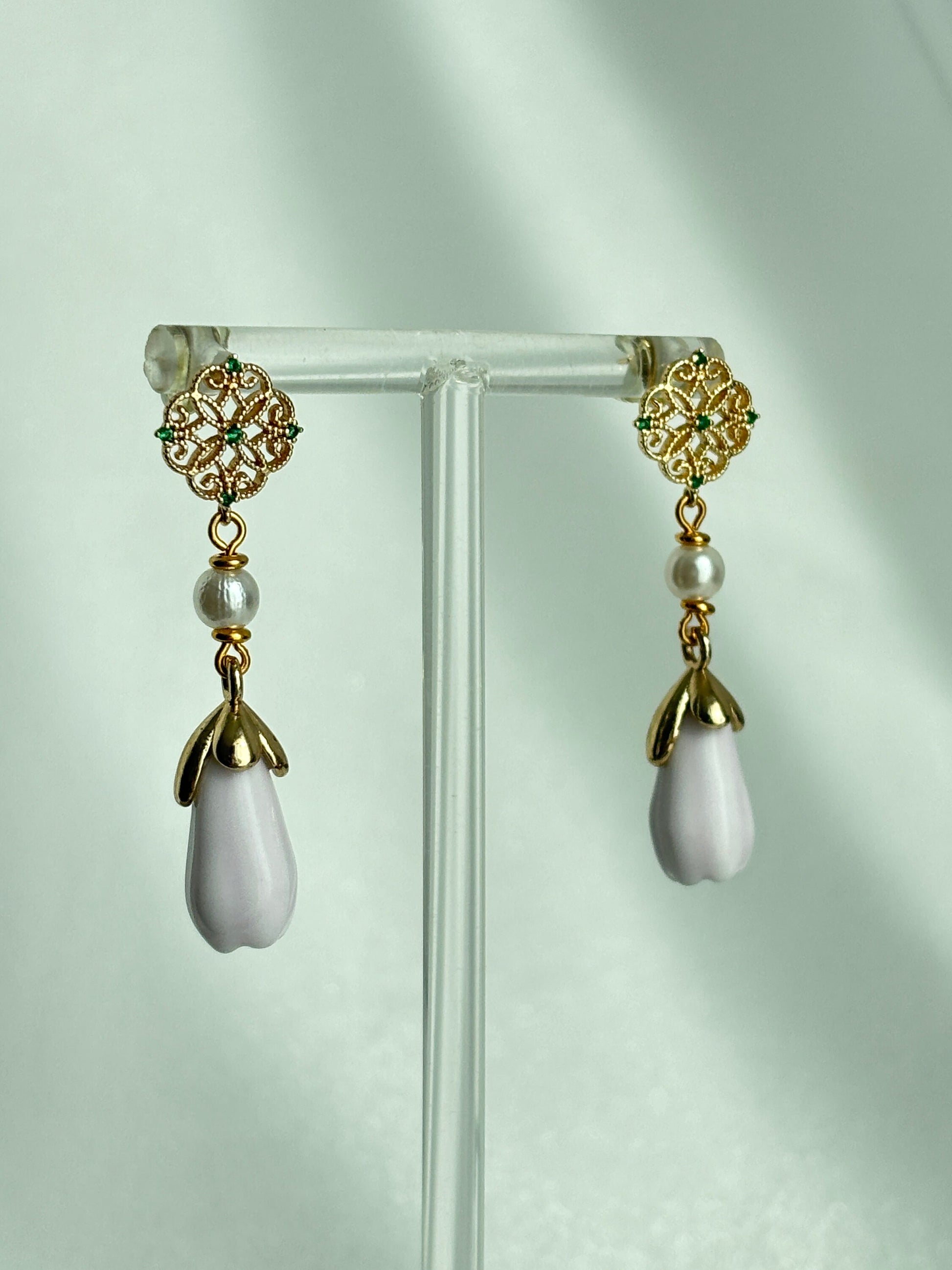 Paired with lustrous round and teardrop ceramic droplet, these earrings evoke the image of fresh dewdrops glistening on a flower at dawn. The combination of the soft glow of the ceramic and the intricate gold filigree creates a stunning display of elegance and sophistication.