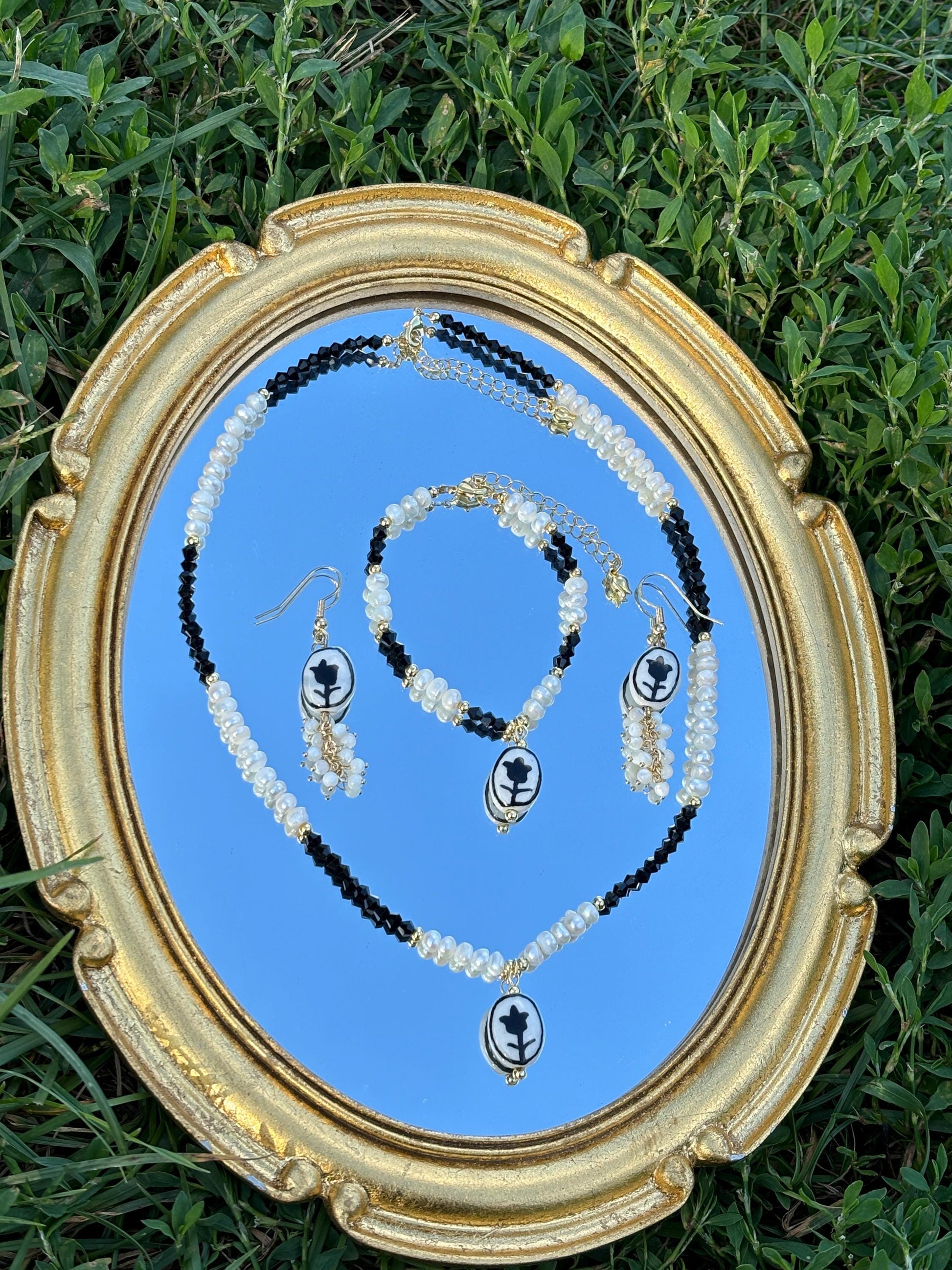 💗 Hand-Painted Porcelain Earrings with Black Tulip Design and Pearl Bead Drops