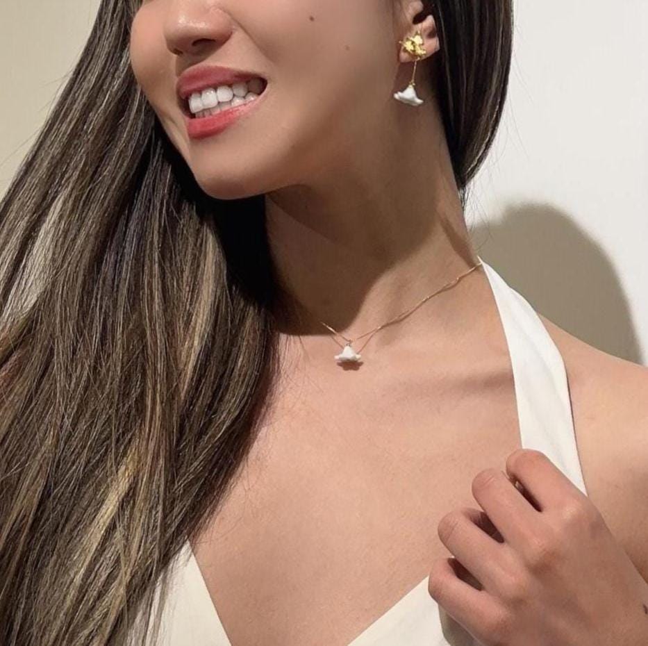 This delicate lily of the valley necklace symbolizes the return of happiness and purity. Handcrafted from ceramic with a graceful pearl nestled within, it is a beautiful and meaningful accessory perfect for weddings, anniversaries, or cherished gifting moments.