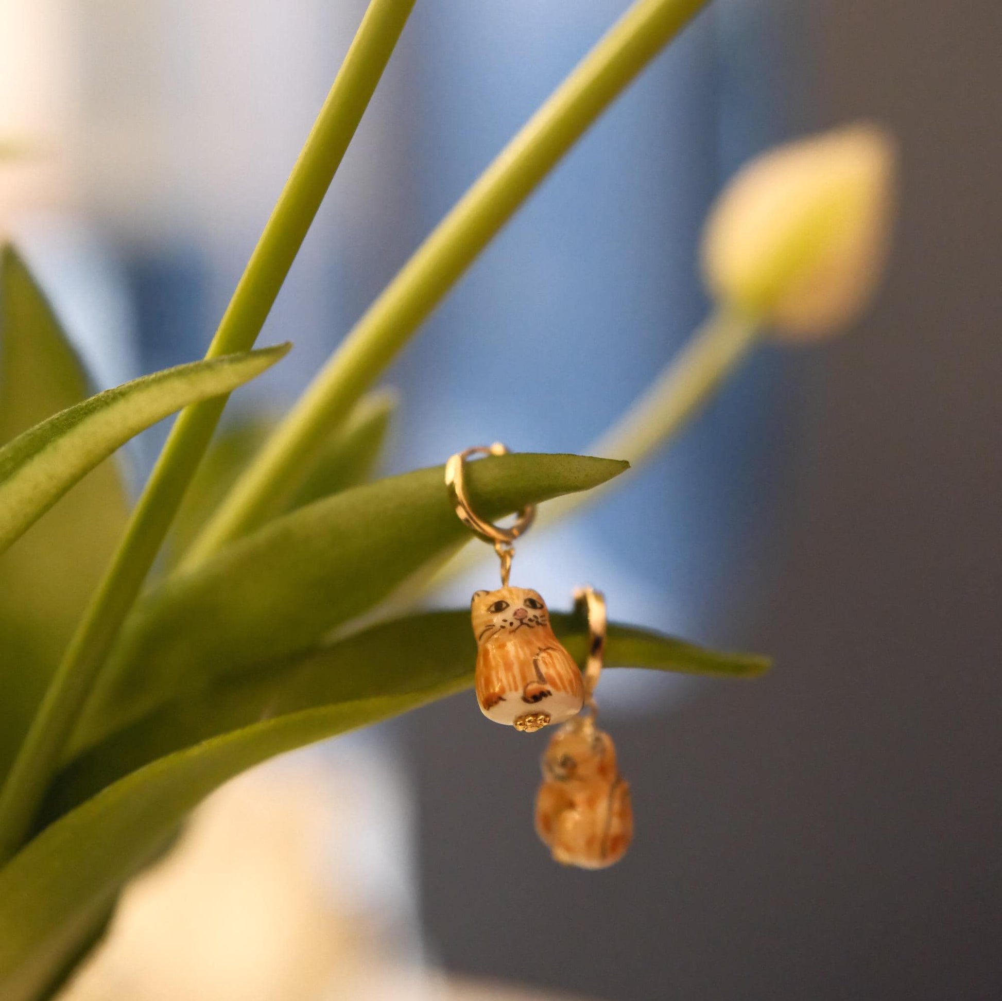 The main piece of this earring is a porcelain kitty, attached to a gold-plated hook.