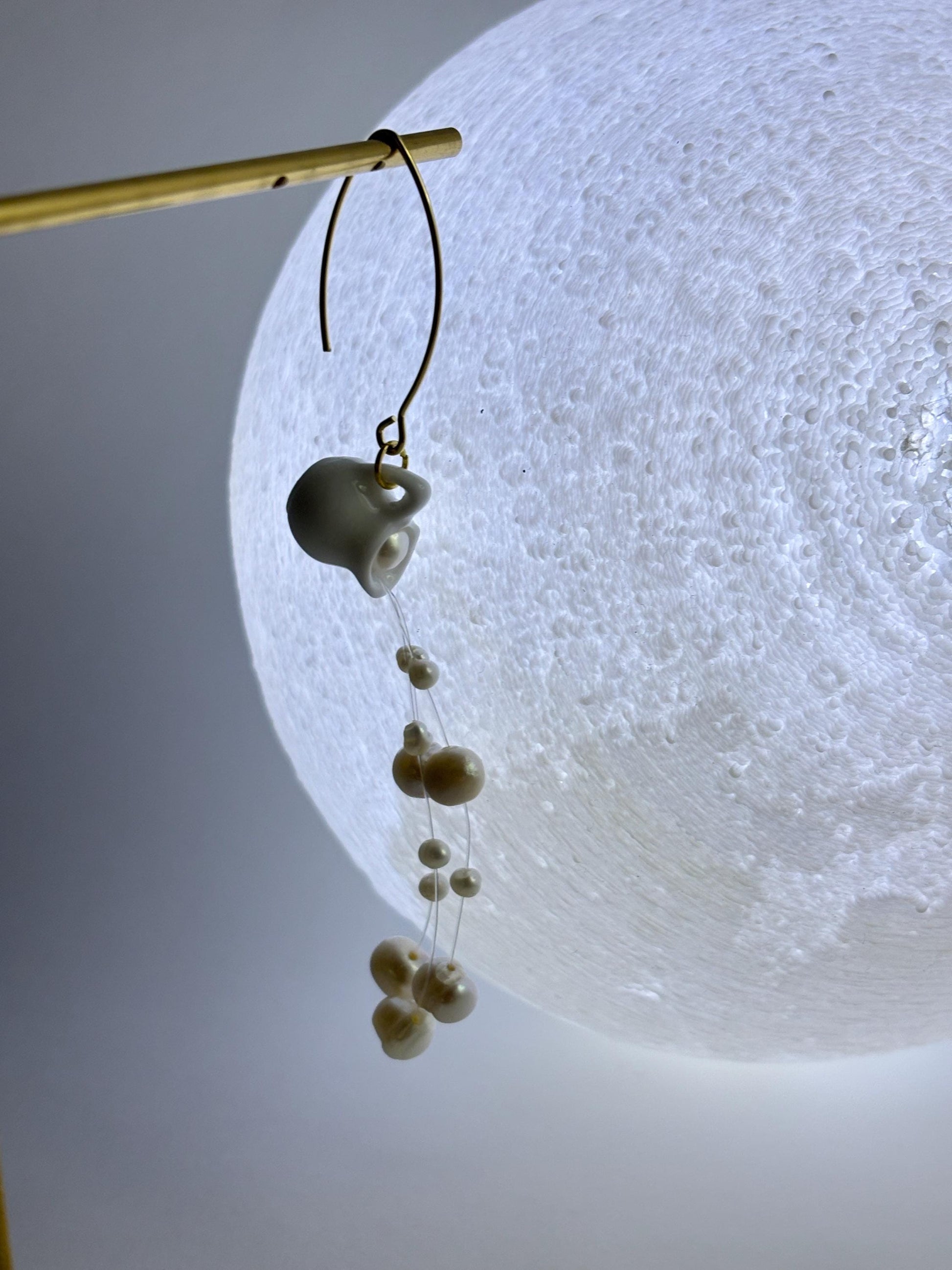 The main piece of this earring is a ceramic "water jug" on a gold-plated hook with a pearl glued inside, a few plastic strings will be connected to the pearl inside the water jug, each string with multiple pearls on it. Please message us for a more detailed view of the earring that you will be getting before placing the order, as each set will be made to order so it WILL be unique and different from one another :)