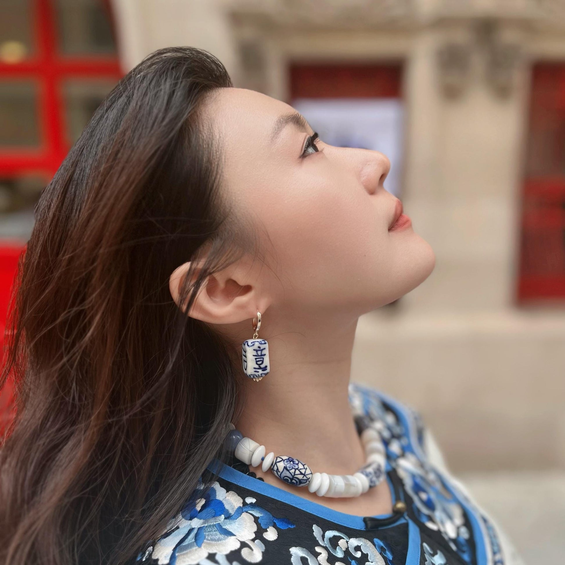 - Earrings: porcelain charms on gold-plated hoops